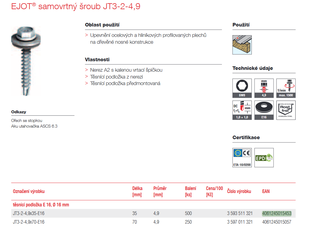 EJOT® samovrtný šroub JT3-2-4,9 s podložkou E16