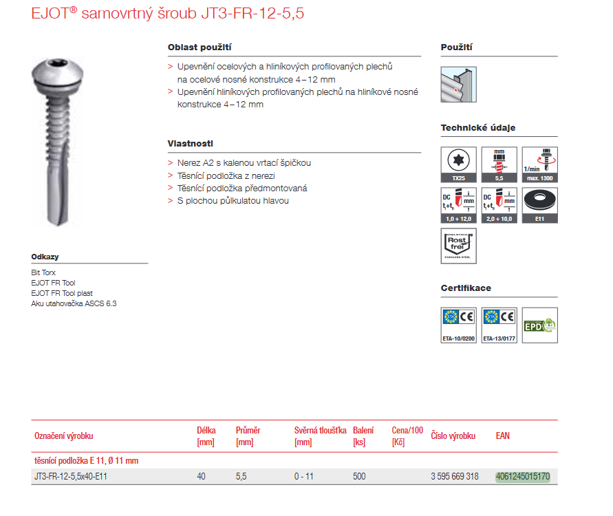EJOT® samovrtný šroub JT3-FR-12-5,5 - 5,5x40 s podložkou E11
