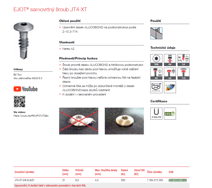 EJOT® samovrtný šroub nerez JT4-XT - 6,0x21mm