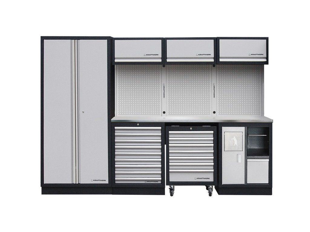 MOBILIO - pracovní stěna 2955 x 458 x 2000mm, modulární systém se 4-mi moduly, pracovní deska INOX, bez příslušenství.- modulární nástěnný systém skříněk MOBILIO - volně stojící konstrukce pro velmi flexibilní instalaci - zásuvky různých výšek, uloženy na kuličkových ložiscích - s centrálním zamykáním, včetně pojistek u jednotlivých zásuvek - pro výbavu KRAFTWERK COMPLETO / EVA / EVA3 - stěnové panely s EURO perforací - pracovní deska INOX obsahuje: - 3 závěsné skříňky s plynovou pružinou - 1 vysoká skříň dvoudvéřová se 4-mi policemi - 1 spodní skříňka s 9-ti zásuvkami - 1 spodnískříňka na kolečkách se 7-mi zásuvkami - 1 spodní skříňka s odpadkovým košem - 2 nerez pracovní desky v rozměru 1361x463x36mm a 680x463x36mm - 3 závěsné děrované panely - 3+1 zadní výztuhyDoplňkové parametry