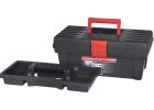 Plastový box na nářadí pro přehledné uložení a snadné přenášení nářadí. Panty vyztužené kovovýmičepy. Kovové zámky. Na víku jsou dvě krabičky na šroubky, vruty, hmoždinky apod....