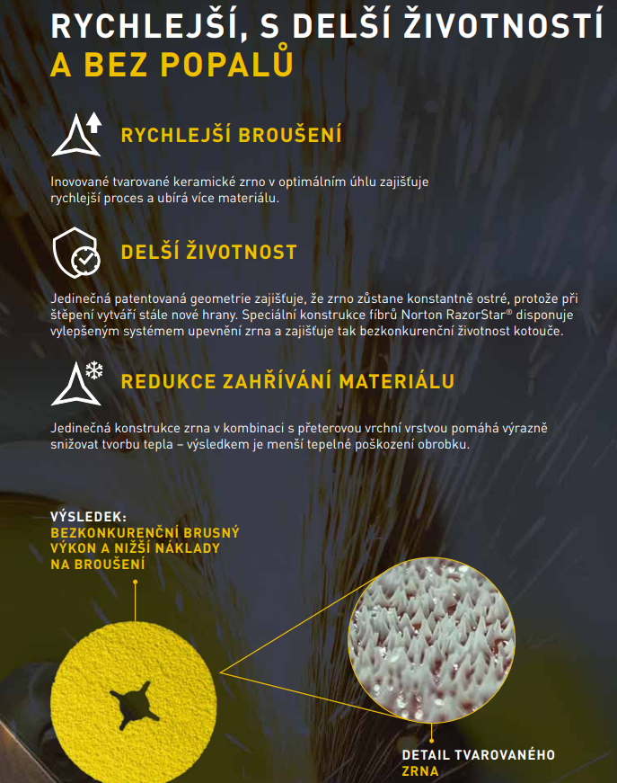 ZCELA NOVÁ ŘADA PŘIPRAVENA SMÁZNOUT Cubitron™ II . EXCELENTNÍ VÝKON A RYCHLOST BROUŠENÍ - FÍBROVÉ KOTOUČE NORTON RAZORSTAR® TECHNOLOGIE TVAROVANÉHO KERAMICKÉHO ZRNA