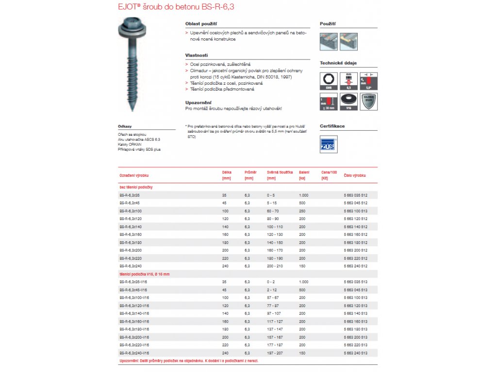EJOT šroub do betonu BS-R-6,3-V16 s podložkou 16mm