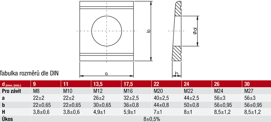 DIN 434 - Čtvercové klínové podložky pro úseky tvaru U , Současná norma: DIN 434 , Ekvivalentní normy: CSN 021739 ; PN 82018 ; UNI 6598