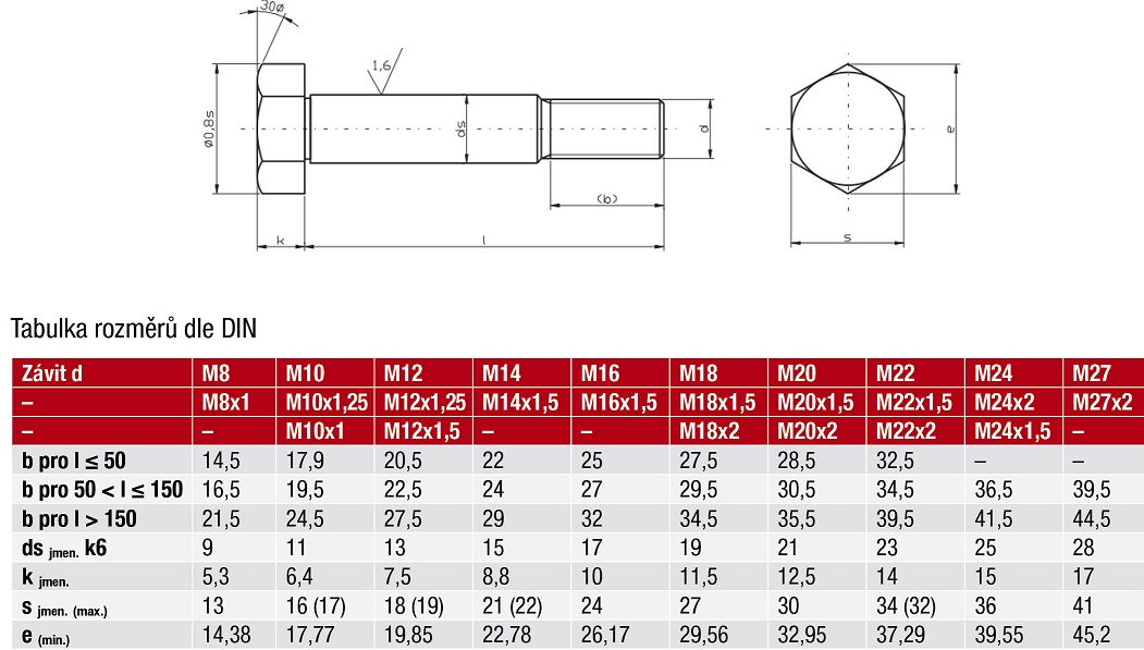 DIN 609 Šestihranné lícované šrouby s dlouhým závitem, Současná norma: DIN 609, Ekvivalentní normy: CSN 021111; PN 82342