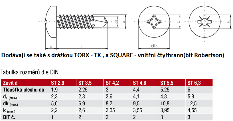 DIN 7504N šroub samovrtný TEX s půlkulatou hlavou DIN7504N