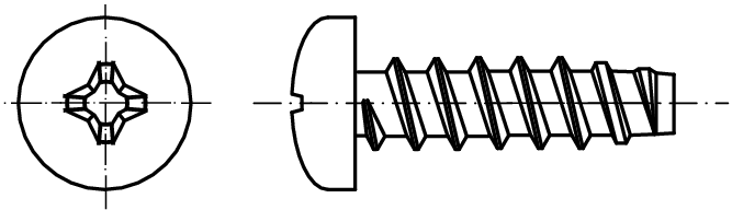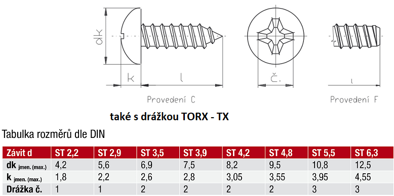 DIN 7981 F - Šrouby do plechu s půlkulatou hlavou a křížovou drážkou H a Z, forma F , Současná norma: DIN ISO 7049 , Ekvivalentní: ISO 7049; CSN 021235; UNI 6954