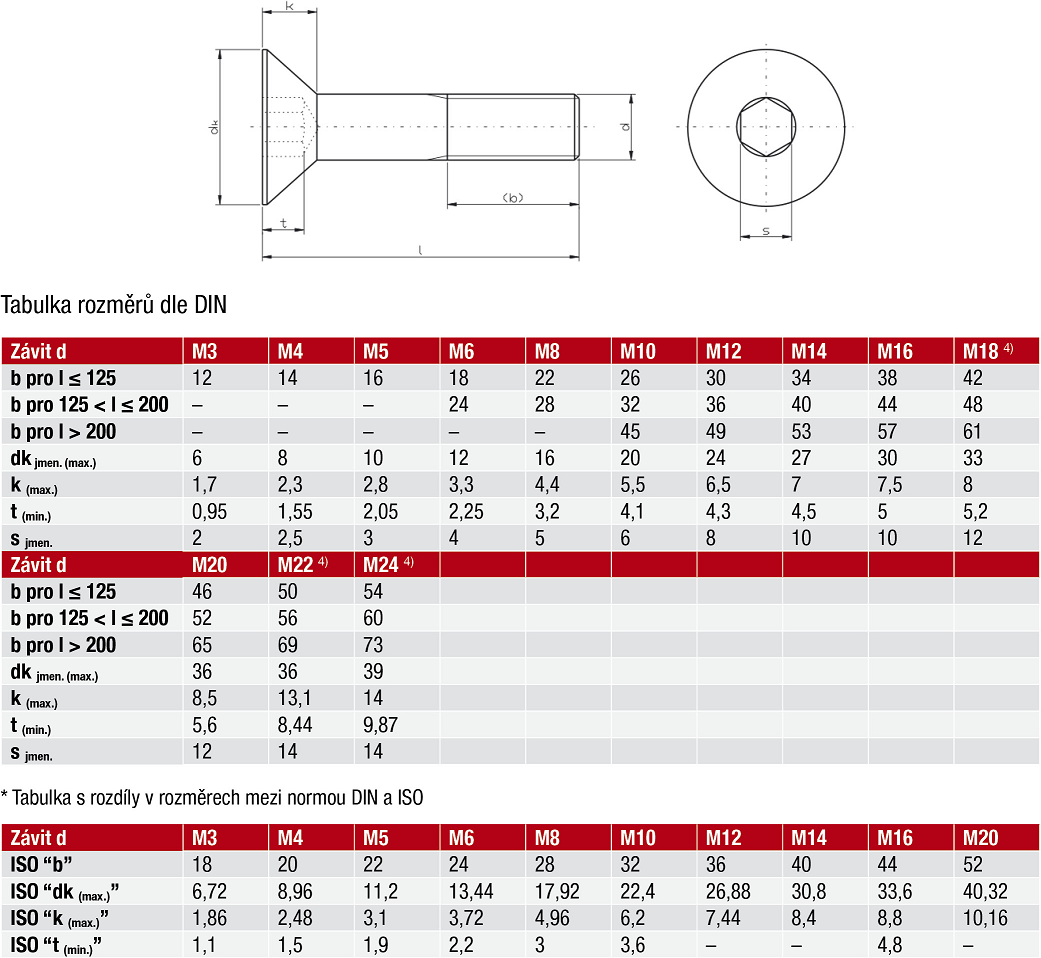 Poznámka:Délka závitu dle dostupnosti.U průměru hlavy šroubu se jedná o teoretickou hodnotu pro maximální průměr hlavy, viz tolerance dle normy.