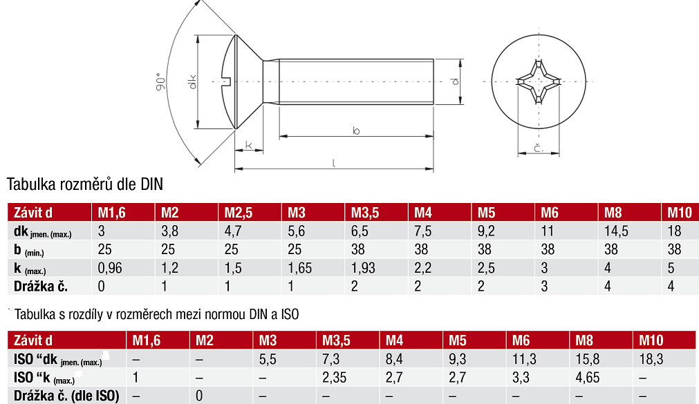 DIN 966 - Šrouby se zápustnou hlavou čočkovitou s křížovou drážkou H nebo Z