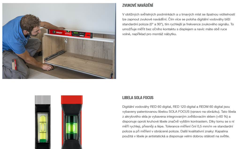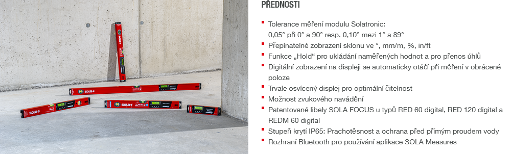 0,1° mezi 1° a 89° - Rozhraní Bluetooth pro použití aplikace SOLA Measures