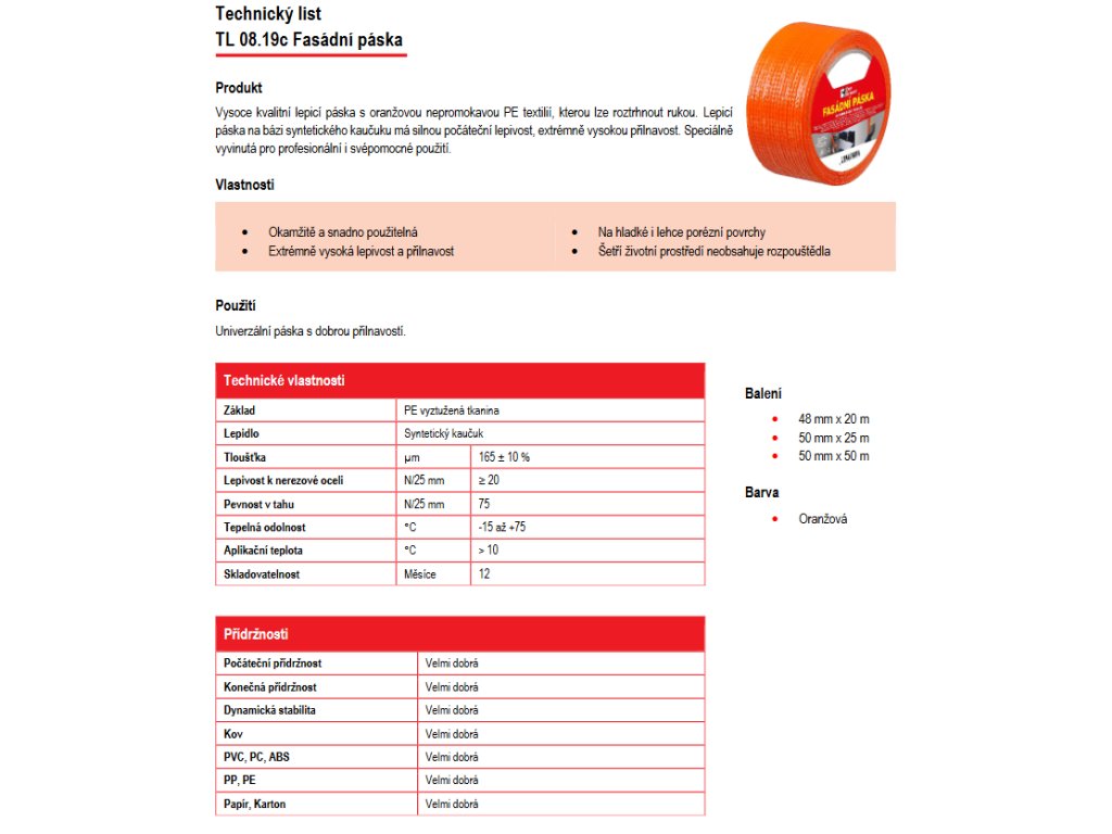 Vysoce kvalitní lepicí páska s oranžovou nepromokavou PE textilií, kterou lze roztrhnout rukou. Lepicí páska na bázi syntetického kaučuku má silnou počáteční lepivost, extrémně vysokou přilnavost. Speciálně vyvinutá pro profesionální i svépomocné použití. Charakteristika okamžitě a snadno použitelná extrémně vysoká lepivost a přilnavost na hladké i lehce porézní povrchy šetří životní prostředí, neobsahuje rozpouštědla Použití vhodná pro interiéry i exteriéry pro vytváření rovných přechodů v omítce vhodná na podklady jako jsou omítky, cihly, beton, dřevo, obklady a další hladké povrchy vhodná pro zavěšování výrobků na stěny, například upevnění těžké ochranné fólie na fasády během renovační práce