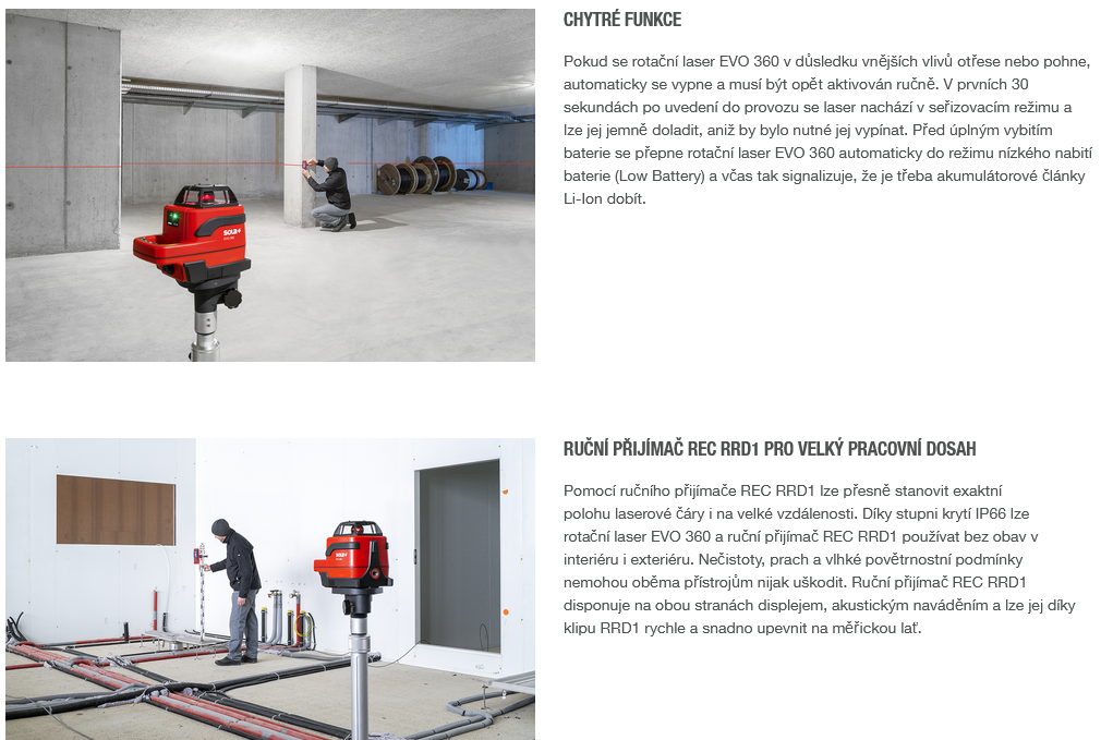 EVO 360 je precizní a uživatelsky praktický rotační laser pro přesnou horizontální a vertikální nivelaci i na velké vzdálenosti. Možností pro použití je skutečně mnoho, ovládaní pouze jedním tlačítkem je pak velmi jednoduché. Samotná nivelace se spustí automaticky při uvedení přístroje do provozu. Polohy se sklonem až 5° rotační laser EVO 360 bez problémů vyrovná. Díky stupni krytí IP66 lze rotační laser EVO 360 a ruční přijímač REC RRD1 používat v interiéru i exteriéru.