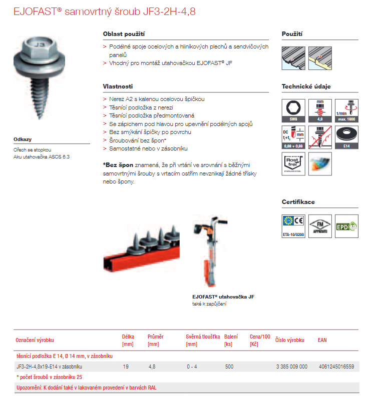 EJOFAST® samovrtný šroub JF3-2H-4,8 - 4,8x19 s podložkou E14 v zásobníku