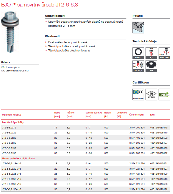 EJOT® samovrtný šroub JT2-6-6,3 s podložkou V16 mm