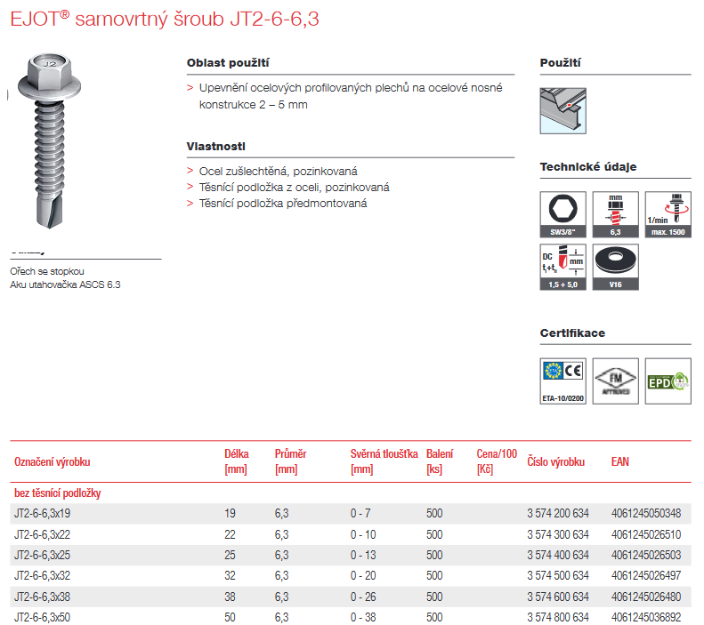 EJOT® samovrtný šroub JT2-6-6,3 bez podložky !!!