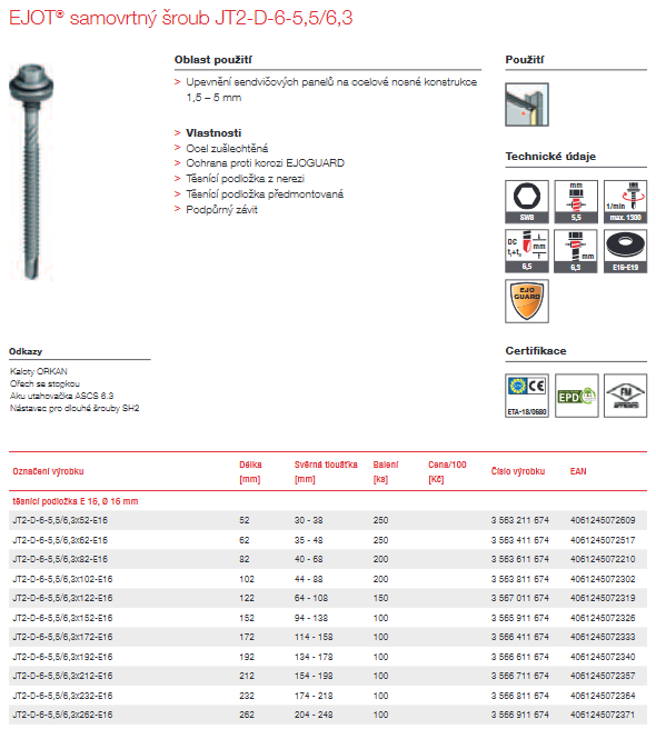 EJOT® samovrtný šroub JT2-D-6-5,5/6,3 EJOGUARD s podložkou 16mm