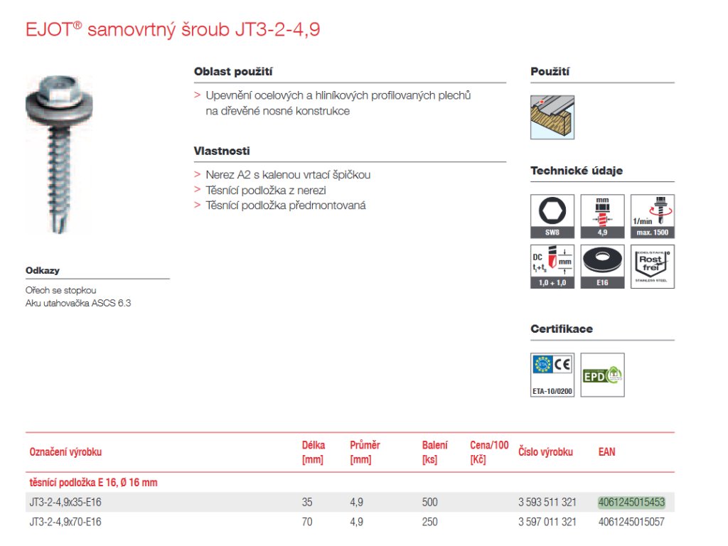 EJOT® samovrtný šroub JT3-2-4,9 s podložkou E16