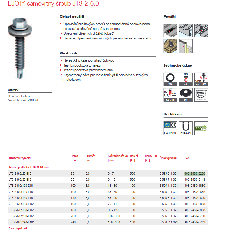 EJOT® samovrtný šroub JT3-2-6,0 s podložkou E16