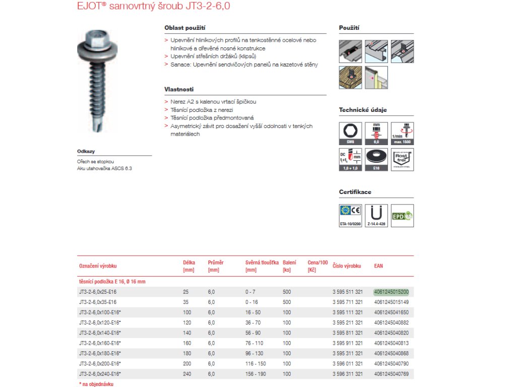 EJOT® samovrtný šroub JT3-2-6,0 s podložkou E16