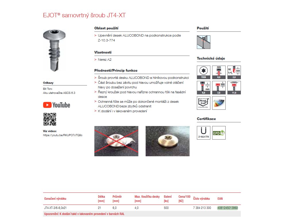 EJOT® samovrtný šroub nerez JT4-XT - 6,0x21mm
