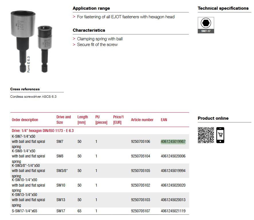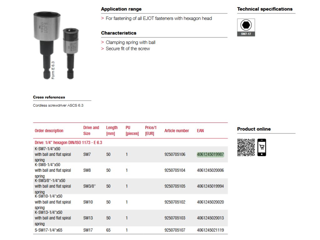 EJOT Ořech se stopkou K-SW-1/4“x50 s kuličkou a pérkem