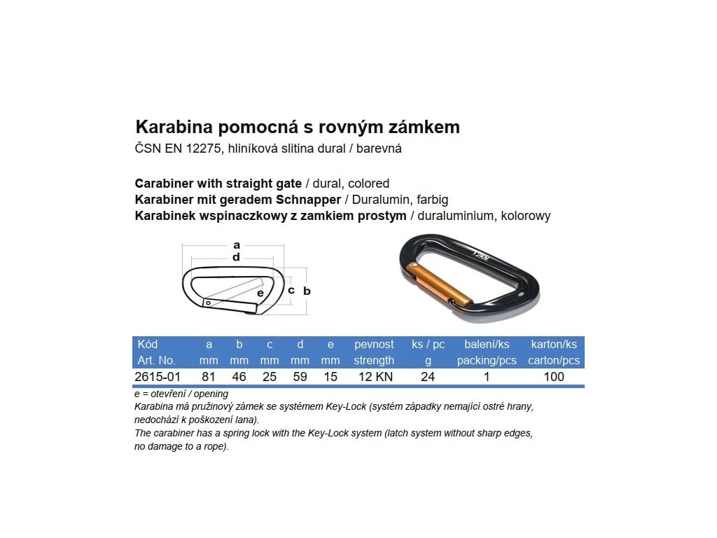 Karabina pomocná s rovným zámkem – je vyrobena z tepelně zušlechtěné hliníkové slitiny (duralu). Karabina má pružinový zámek se systémem Key-Lock (systém západky nemající ostré hrany, nedochází k poškození lana). Pevnost: 12KN. Světlost (maximální otevření): 15mm. Hmotnost: 24g.