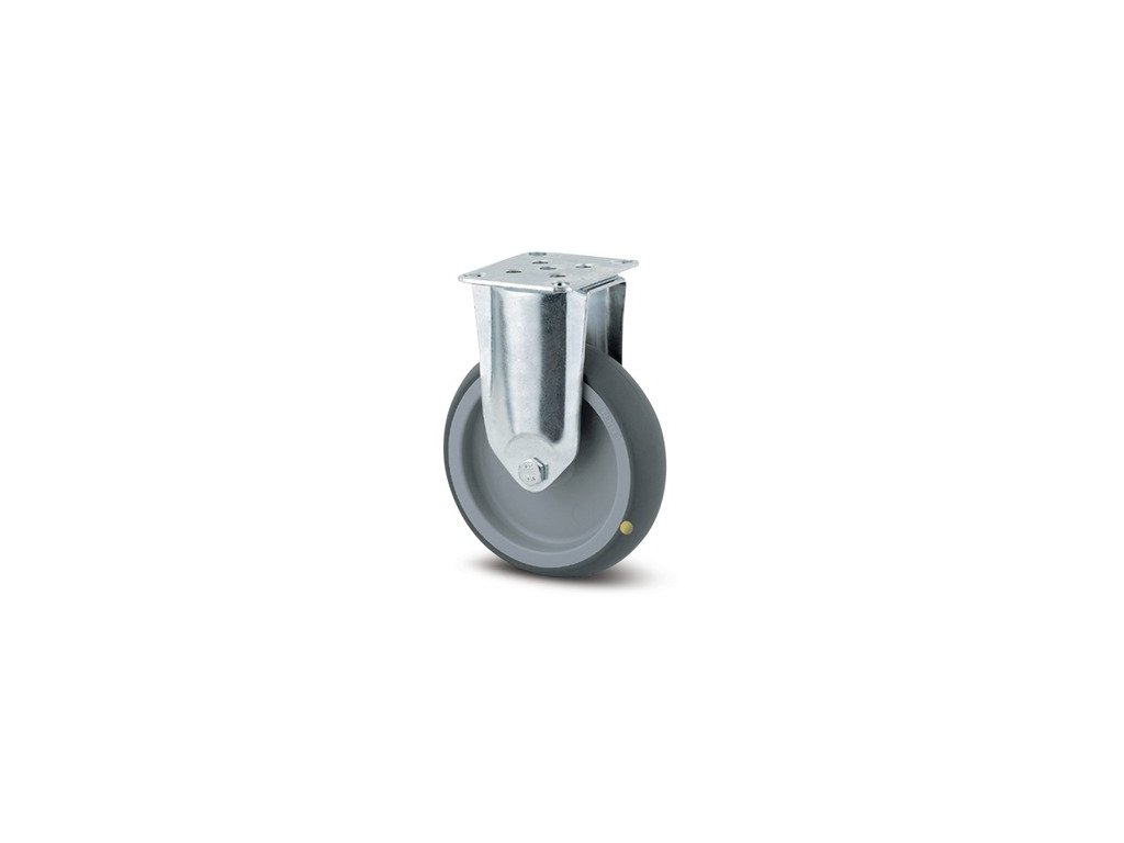 Pevné kolečko, Vidlice vyrobena z ocelového výlisku, zinkochromátováno, kolečko se šroubem a maticí, uchycení s plotýnkou. Podélná strana upevňovací desky příčně ke směru jízdy. Střed kolečka vyroben z polypropylénu, elektricky vodivý, Běhoun: TENTEprén (termoplastická guma), šedá-neznačkující, kluzné uložení
