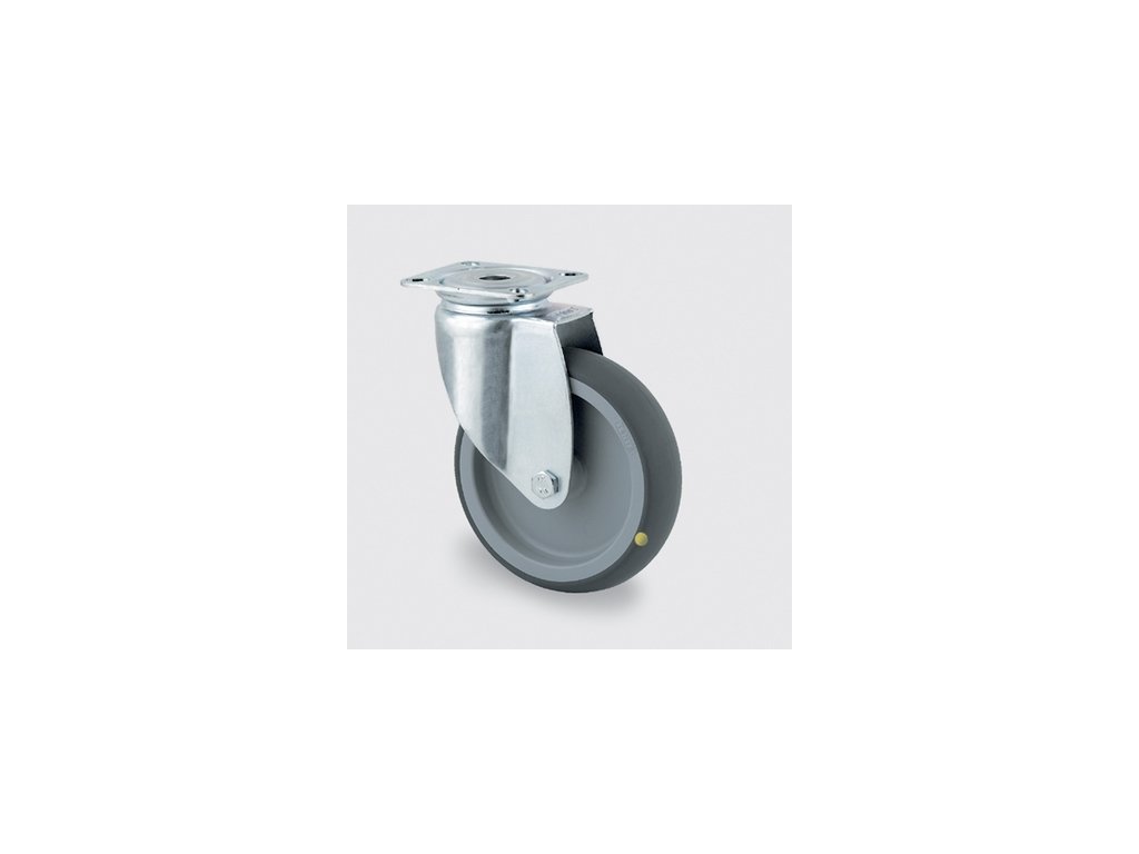Otočné kolečko, Vidlice vyrobena z ocelového výlisku, pozinkováno, dvojité kuličkové ložisko v otočné hlavě, kolečko se šroubem a maticí, uchycení s plotýnkou. Střed kolečka vyroben z polypropylénu, elektricky vodivý, Běhoun: TENTEprén (termoplastická guma), šedá-neznačkující, kluzné uložení