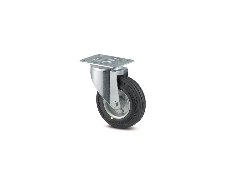 Otočné kolečko, Vidlice kolečka vyrobena z ocelového výlisku, pozinkováno, dvouřadá kuličková dráha v otočné hlavě, kolo uchyceno šroubem a matkou, protivláknový kryt, uchycení s plotýnkou. Střed kolečka vyroben z ocelového výlisku, Běhoun: gumová obruč, černá, elektricky vodivé, jehlové ložisko