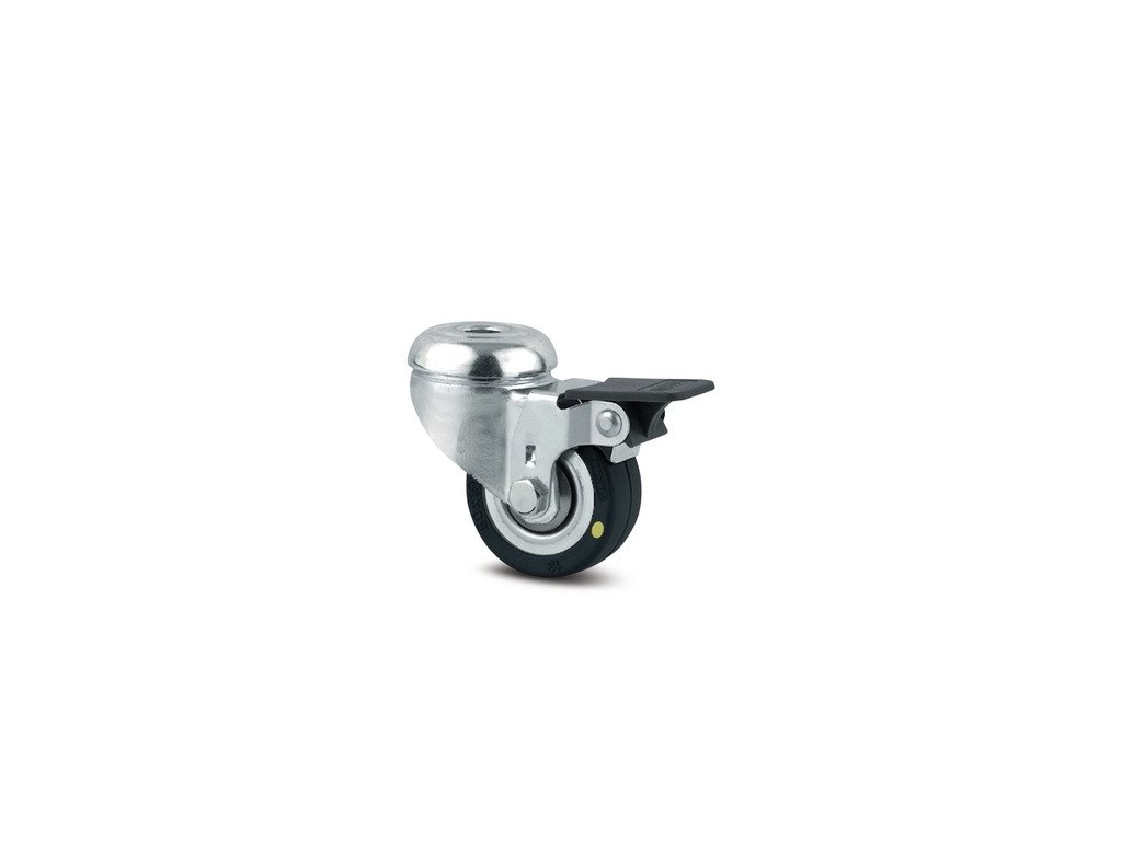 Otočné kolečko s brzdou kola, Vidlice vyrobena z ocelového výlisku, pozinkováno, dvojité kuličkové ložisko v otočné hlavě, otvor pro čep. Střed kolečka vyroben z ocelového výlisku