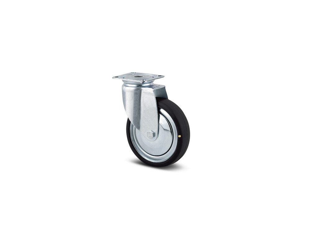 Otočné kolečko, Vidlice vyrobena z ocelového výlisku, pozinkováno, dvojité kuličkové ložisko v otočné hlavě, uchycení s plotýnkou. Střed kolečka vyroben z ocelového výlisku, Běhoun: gumová obruč, černá-nečernící, protivláknové kryty, kuželové ložisko