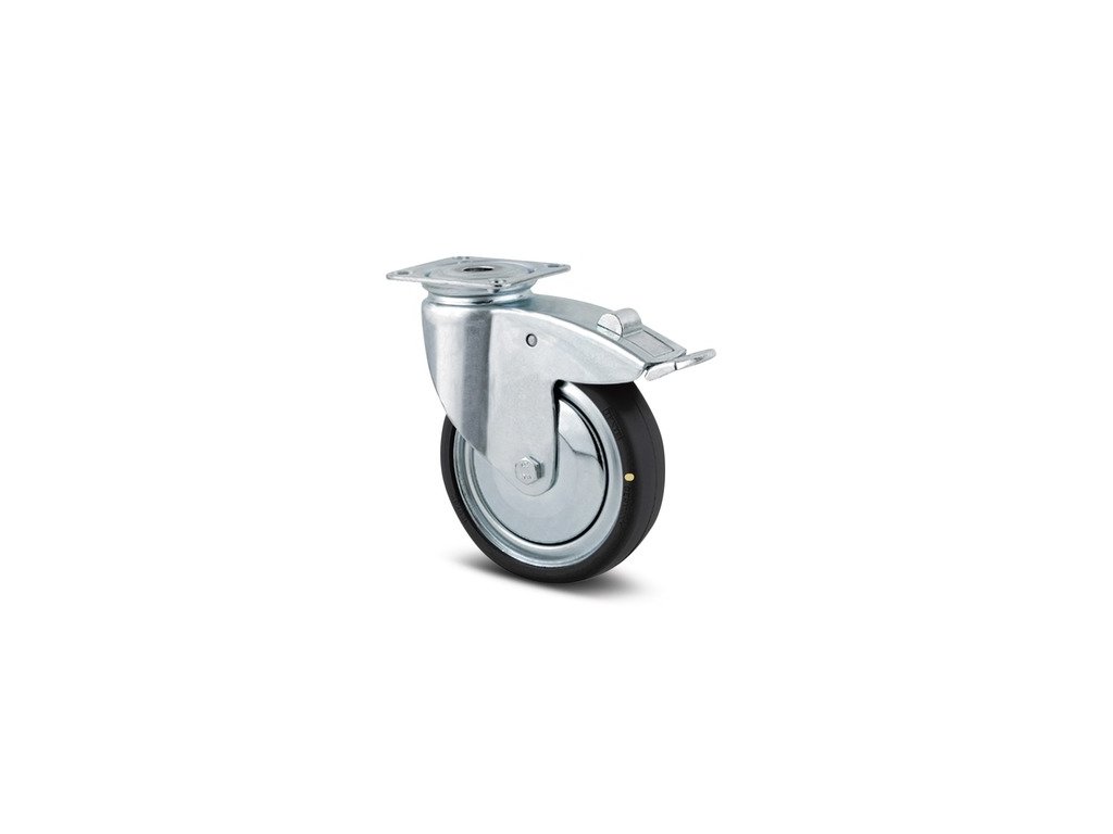 Otočné kolečko s totální brzdou, v zadní části kola, Vidlice vyrobena z ocelového výlisku, pozinkováno, dvojité kuličkové ložisko v otočné hlavě, uchycení s plotýnkou. Střed kolečka vyroben z ocelového výlisku, Běhoun: gumová obruč, černá-nečernící, protivláknové kryty, kuželové ložisko