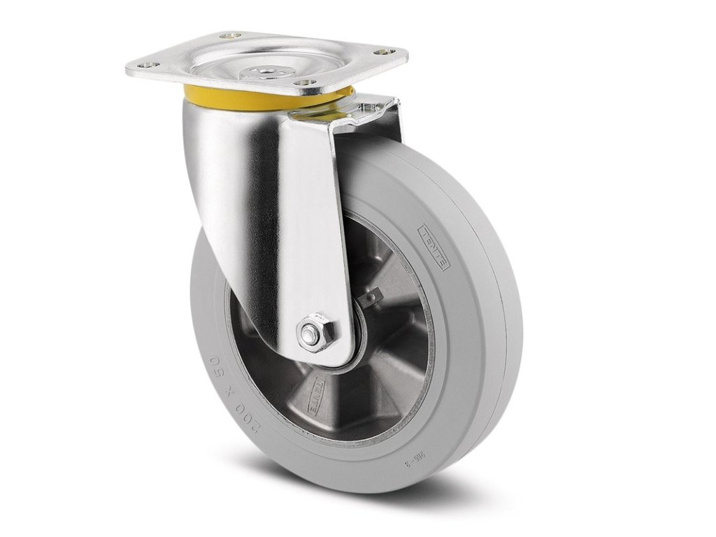ESD otočné kolečko, Vidlice vyrobena z velmi siného ocelového výlisku, zesíleno, modře zinkováno, utěsněná zesílená dvouřadá kuličková dráha v otočné hlavě kola, tepelně zpracovaný povrh kuliček, zanýtováno masivním nýtem, kolo se šroubem a maticí, uchycení s plotýnkou. Střed kolečka vyroben z hliníkové slitiny, Běhoun: černá elastická navulkanizovaná guma, šedá neznačkující, přesné kuličkové ložisko