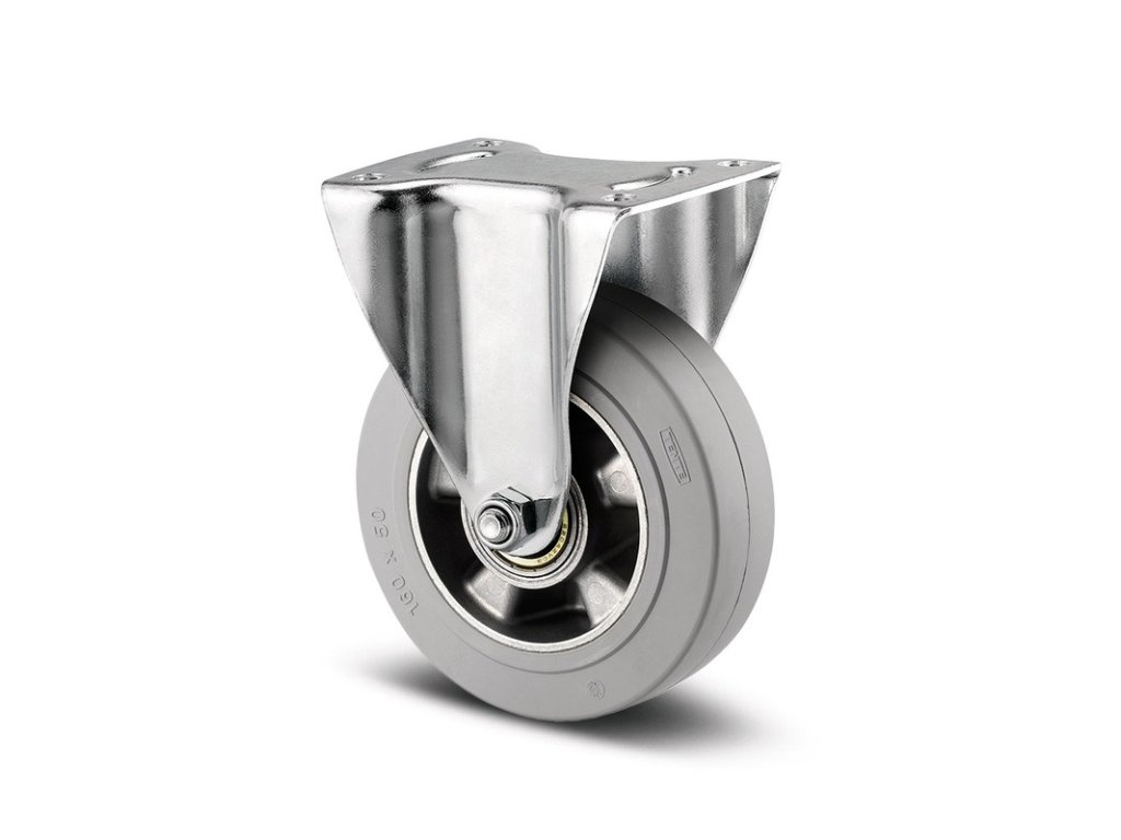 ESD pevné kolečko, Vidlice vyrobena z ocelového výlisku, pozinkováno, kolo uchyceno středovým šroubem s maticí, uchycení s plotýnkou. Střed kolečka vyroben z hliníkové slitiny, Běhoun: černá elastická navulkanizovaná guma, šedá neznačkující, přesné kuličkové ložisko