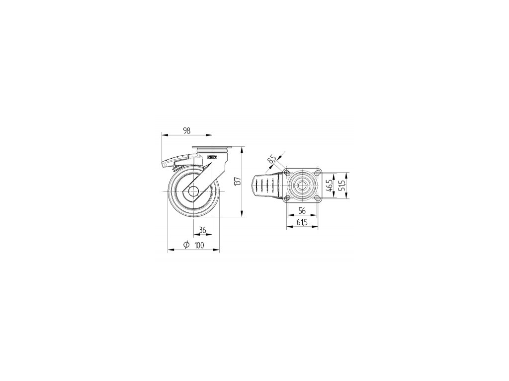 Kolečko přístrojové - plastové 100mm, s brzdou, plotýnka, 5377PJP100P50