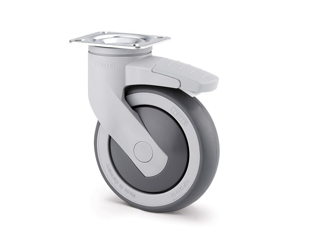 Otočné kolečko s totální brzdou, v zadní části kola, Vidlice a kolečka vyrobeny z vysoce kvalitních syntetických materiálů, dvojitá kuličková dráha v otočné hlavě , uchycení s plotýnkou. Střed kolečka vyroben z polypropylénu, Běhoun: TENTEprén (termoplastická guma),neznačkující, protivláknový kryt, přesné kuličkové ložisko Návrh: Kola jsou k dostání také s brzdou v šedé barvě.