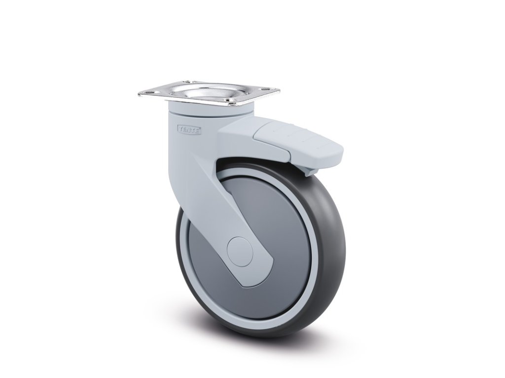 Otočné kolečko s totální brzdou, v zadní části kola, Vidlice a kolečka vyrobeny z vysoce kvalitních syntetických materiálů, dvojitá kuličková dráha v otočné hlavě , uchycení s plotýnkou. Střed kolečka vyroben z polypropylénu, Běhoun: TENTEprén (termoplastická guma),neznačkující, protivláknový kryt, přesné kuličkové ložisko Návrh: Kola jsou k dostání také s brzdou v šedé barvě.
