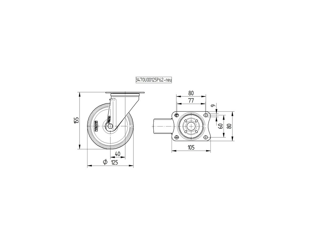 Kolečko pro transportní zařízení 125mm, otočné, plotýnka, 3470UOO125P62