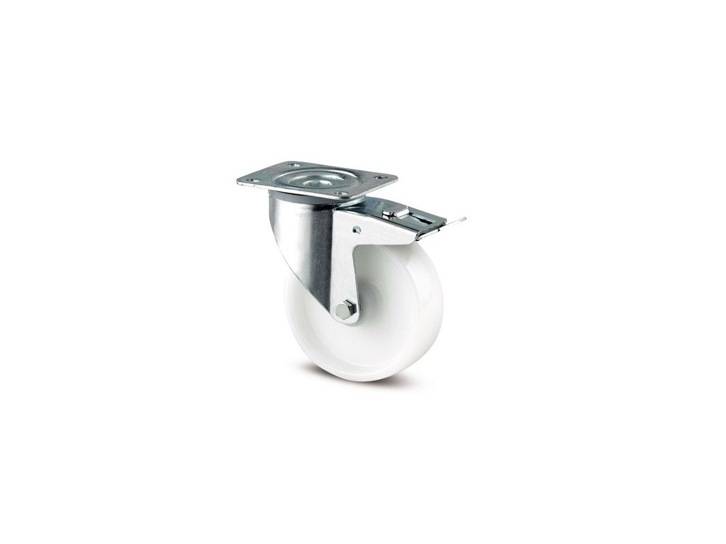 Otočné kolečko s totální brzdou, v zadní části kola, Vidlice kolečka vyrobena z ocelového výlisku, pozinkováno, dvouřadá kuličková dráha v otočné hlavě, kolo uchyceno šroubem a matkou, protivláknový kryt, uchycení s plotýnkou. Střed kola vyroben z polyamidu, jehlové ložisko
