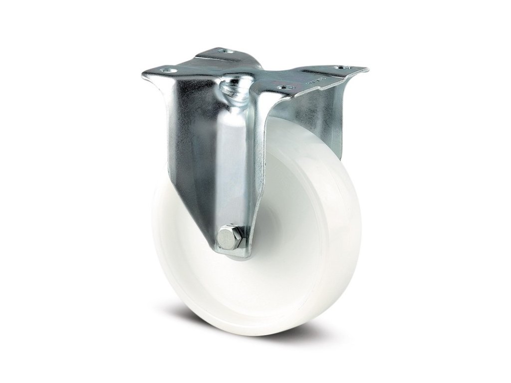 Pevné kolečko, Vidlice vyrobena z ocelového výlisku, pozinkováno, kolo uchyceno středovým šroubem s maticí, uchycení s plotýnkou. Střed kolečka vyroben z polyamidu, kluzné uložení