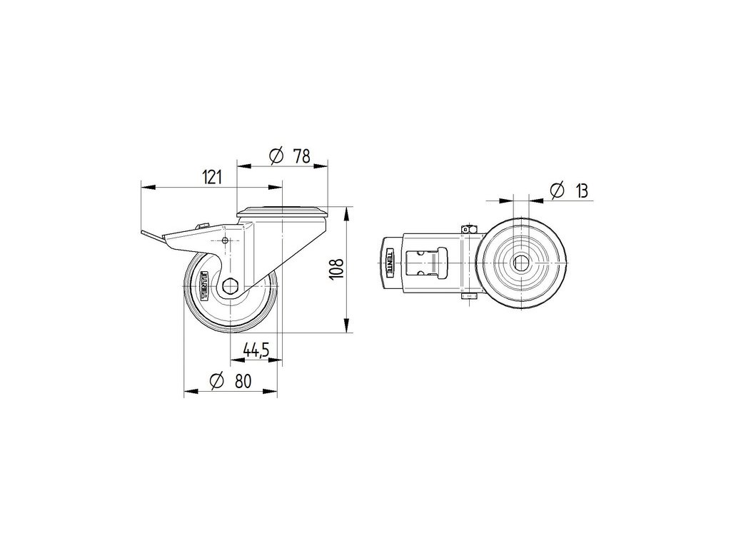 Kolečko pro transportní zařízení 80mm, s brzdou, otvor pro čep, 3477UOO080P30-13
