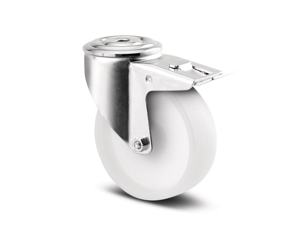 Otočné kolečko s totální brzdou, v zadní části kola, Vidlice kolečka vyrobena z ocelového výlisku, pozinkováno, dvouřadá kuličková dráha v otočné hlavě, kolo uchyceno šroubem a matkou, otvor pro čep. Střed kolečka vyroben z polyamidu, kluzné uložení