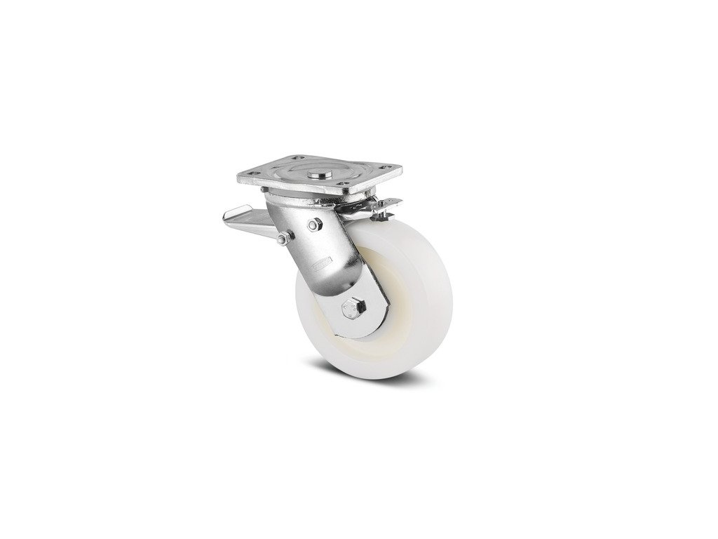 Otočné kolečko s totální brzdou, hlava nahoře kola, Vidlice a plotna ze svařované oceli, zinkochromát, utěsněné ložisko s dvojitým speciálním kuličkovo-kuželovým ložiskem, snýtováno pevným nýtem a samojistící zajištěnou maticí, maznice, kolo se šroubem a maticí, uchycení s plotýnkou. Střed kola vyroben z polyamidu, vysoké zatížení, přesné kuličkové ložisko