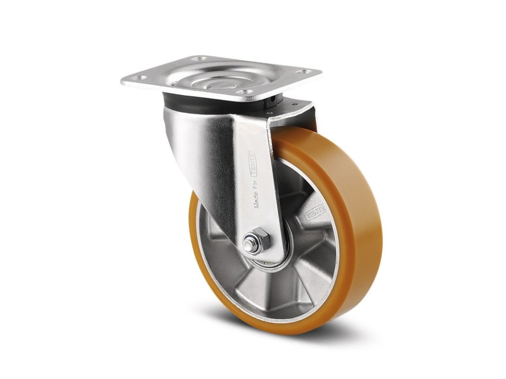 Otočné kolečko, Vidlice vyrobena z ocelového výlisku, pozinkováno, kolo uchyceno středovým šroubem s maticí, uchycení s plotýnkou. Střed kolečka vyroben z hliníkové slitiny, Běhoun: polyuretan, odlévaný, přesné kuličkové ložisko