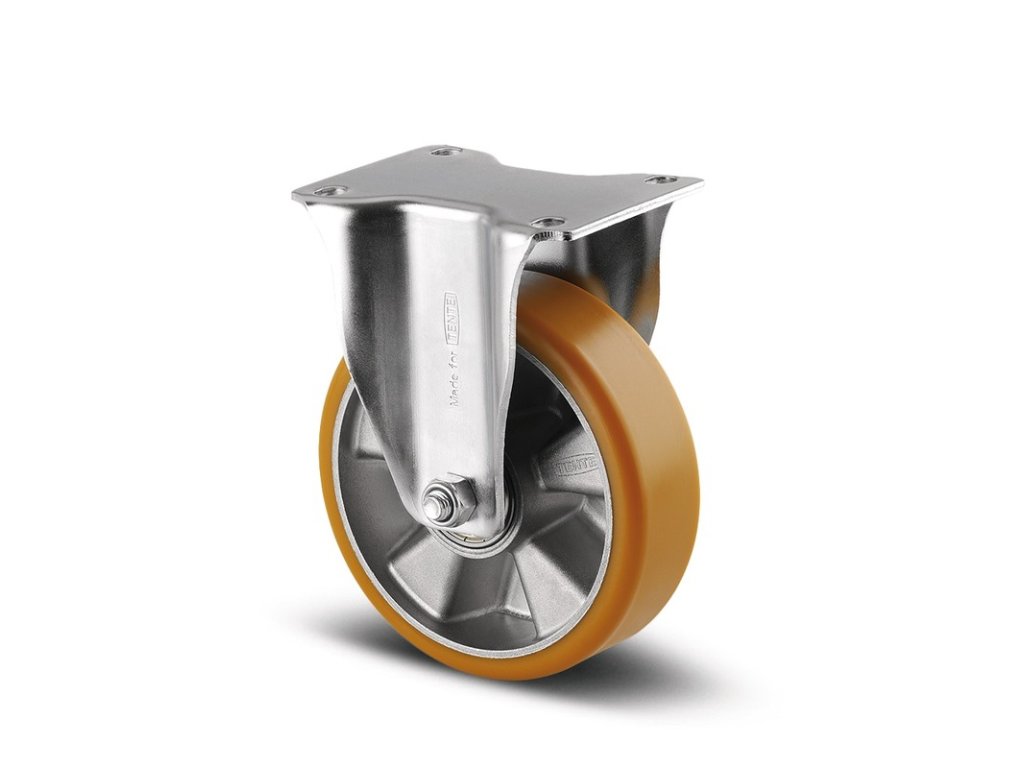 Pevné kolečko, Vidlice vyrobena z ocelového výlisku, pozinkováno, kolo uchyceno středovým šroubem s maticí, uchycení s plotýnkou. Střed kolečka vyroben z hliníkové slitiny, Běhoun: polyuretan, odlévaný, přesné kuličkové ložisko