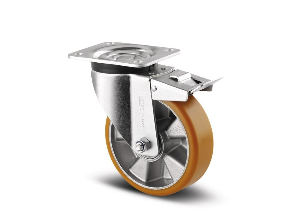 Otočné kolečko s totální brzdou, v zadní části kola, Vidlice vyrobena z ocelového výlisku, pozinkováno, kolo uchyceno středovým šroubem s maticí, uchycení s plotýnkou. Střed kolečka vyroben z hliníkové slitiny, Běhoun: polyuretan, odlévaný, přesné kuličkové ložisko