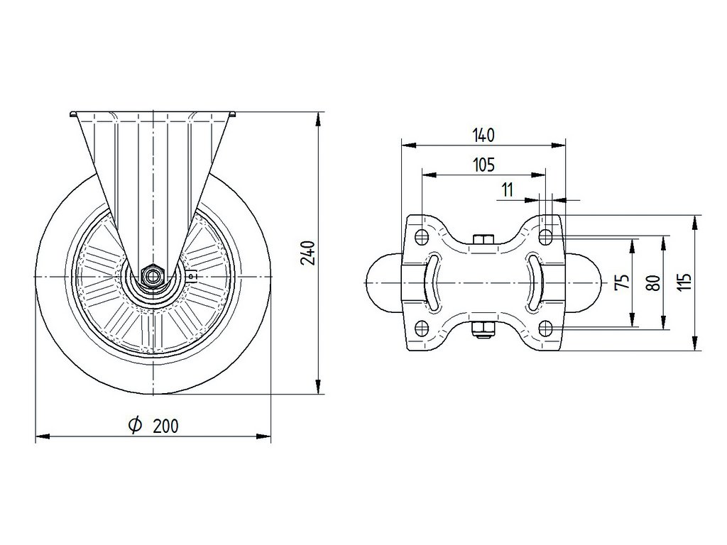 Pevné kolečko, Vidlice vyrobena z ocelového výlisku, pozinkováno, kolo uchyceno středovým šroubem s maticí, uchycení s plotýnkou.