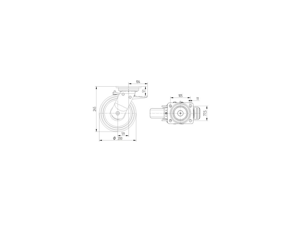 Otočné kolečko s totální brzdou, hlava nahoře kola, Vidlice a plotna ze svařované oceli, zinkochromát, utěsněné ložisko s dvojitým speciálním kuličkovo-kuželovým ložiskem, snýtováno pevným nýtem a samojistící zajištěnou maticí, maznice, kolo se šroubem a maticí, uchycení s plotýnkou. Střed kolečka vyroben z litiny, Běhoun: polyuretan, odlévaný, přesné kuličkové ložisko.