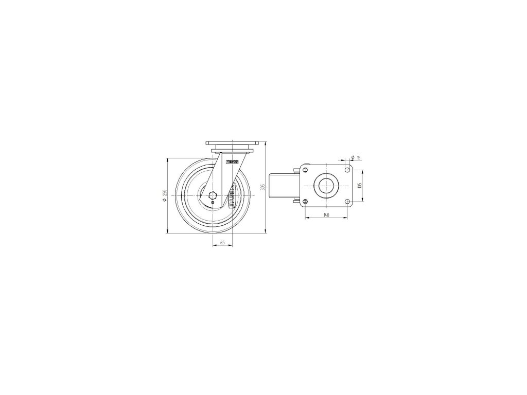 Kolečko pro vysoké zatížení 250mm, otočné, plotýnka, 9650FTP250x80P64