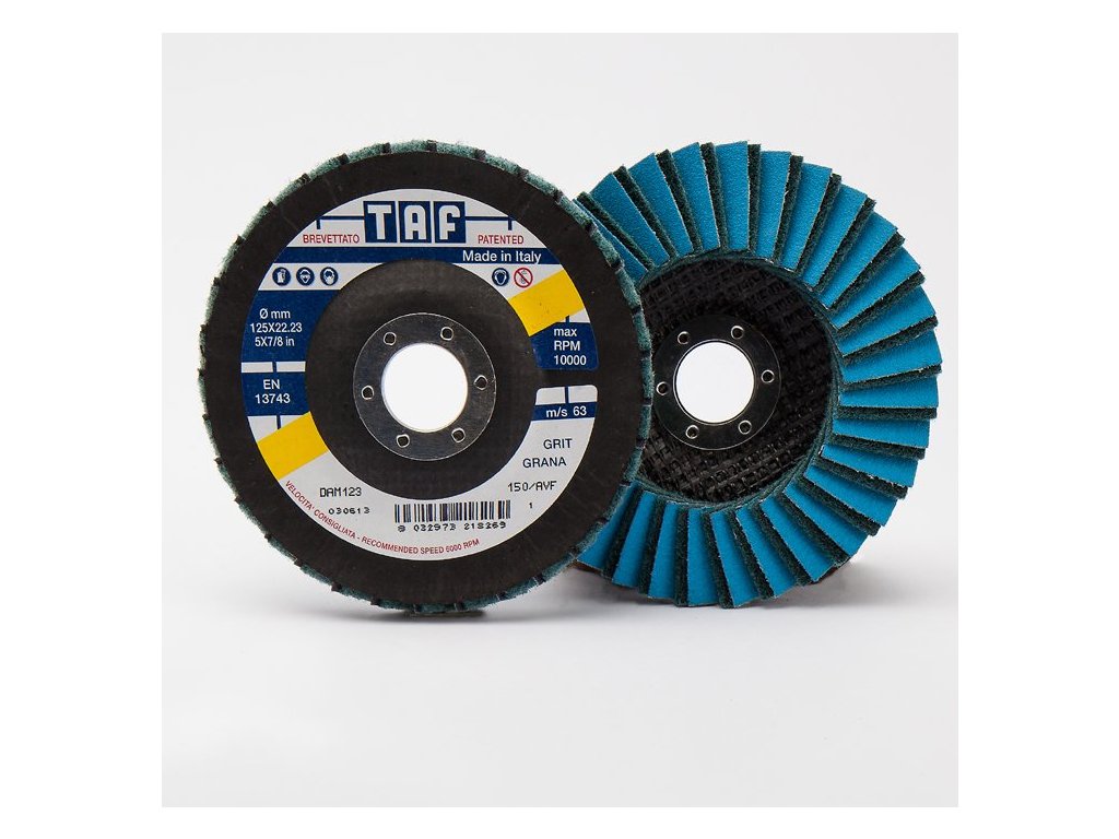 Tento inovativní brusný nástroj se skládá z abrazivního plátno a netkaného vlákna přilepených na podložní desku ze skleněných vláken. Disk TAF DAM umožňuje brousit svary a poskytovat bezchybný povrch v jediné operaci s úžasnými výsledky. Abrazivní tkanina neobsahuje oxid železitý, aby se zabránilo kontaminaci nerezovou ocelí, a je naplněna brusným pomocníkem pro nízkou tvorbu tepla. Klapkové disky DAM jsou vhodné pro následující materiály: nerezové oceli, hliník, speciální slitiny, měkké kovy, karoserie a dřevo. Nejlepší výkony lze dosáhnout při 6000 otáčkách za minutu.